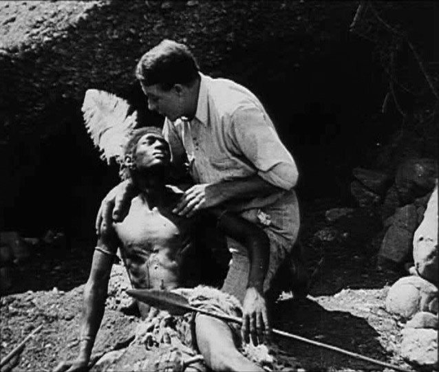 Or is that so? I have to say in this connexion that I’m puzzled by that narrative comment very near the end, when we last see Ushakapilla perched on the rock: “Here endeth the reign of the black Chief, until time make him white and he prove himself worthy to rule this country as the great white Chief does” (Intertitle 119). What on earth are we to make of that? Is he about to sacrifice himself, Golden Bough-style? It’s the “until time makes him white” bit that is puzzling. (This is a translation of the caption in the German-language print. If it is different in the original, now lost, English version, that might be significant.) Is “white” meant simply as a metaphor for “civilized” or “wise”? In which case—and if he is not about to fling himself off the rock—the message here would seem to be that he or his kind might be fit to supplant the colonial authorities in time. Maybe.